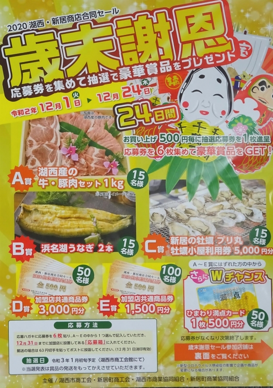応募ハガキに応募券を6枚貼り、A賞~E賞の中から1つ選んで記入12月31日までに加盟店に設置してある応募箱にいれるか、郵送の場合は、63円切手をはってポストに投函してください。(12月31日消印有効)但し応募券がなくなり次第終了。抽選日は令和3年1月初旬予定。当選発表は商品の発送をもってかえさせていただきます。