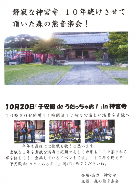 2024年10月20日湖西市新居町寺道内神宮寺にて第10回子安殿de歌っちゃおを開催いたします。市内外から普段の練習の成果を皆様の聞いていただけることを楽しみにしている23組の演者さんが3曲ずつ演奏を披露してまいります。お寺は皆さんが集う場所!をコンセプトに住職が快くお寺を貸してくださいました、ぜひお越しください。観覧は無料ですがお寺さんですので出来ればお賽銭をお気持ちして頂けると嬉しいです。開催日時など