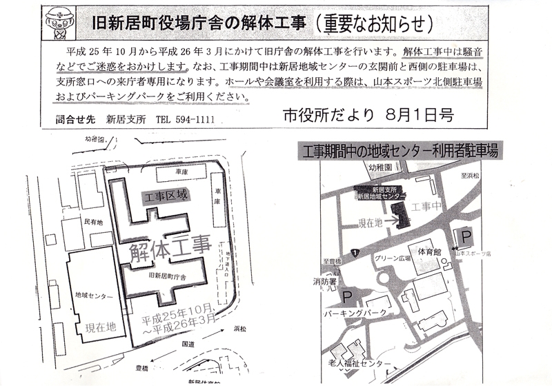 解体工事中は騒音などでご迷惑をおかけします。なお、工事期間中は新居地域センターの玄関前と西側の駐車場は、支所窓口への来庁者専用になります。