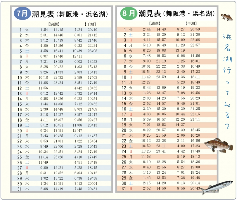 TOP > トピック一覧 > 地域情報 > 7月8月の浜名湖、舞阪、潮見表