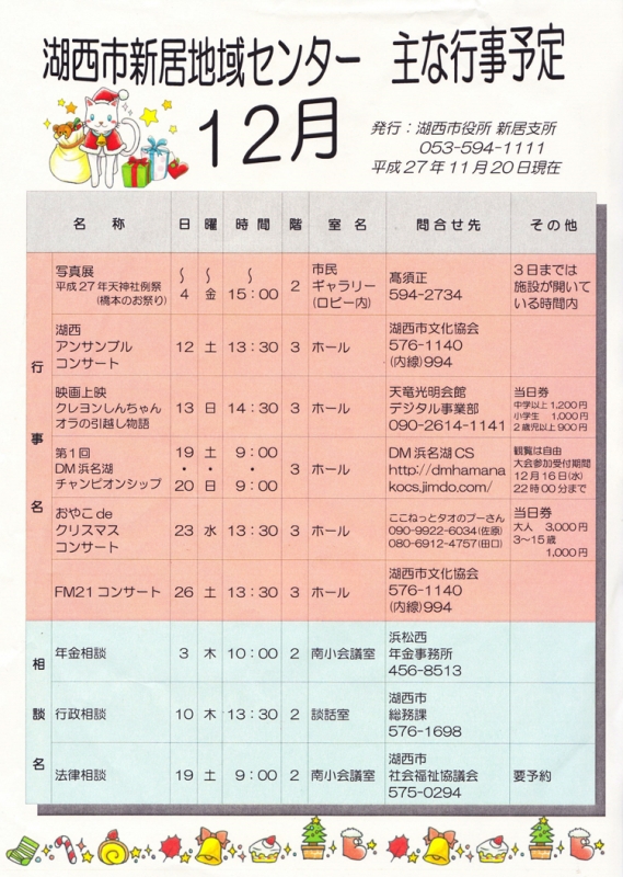 TOP > トピック一覧 > 地域情報 > 12月湖西市新居地域センター 主な行事予定