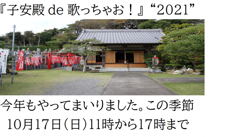 歌っちゃお』in神宮寺が11時30分~17時まで開催されます。音を楽しむをコンセプトに神宮寺さん境内をお借りしてのお外ライブです。「移さない移らない」を心がけてコロナ対策をしてまいります。興味のある方は遊びに来てください。ただし駐車場には限りがございます。公共交通機関並びに徒歩等でのお願いを致します。