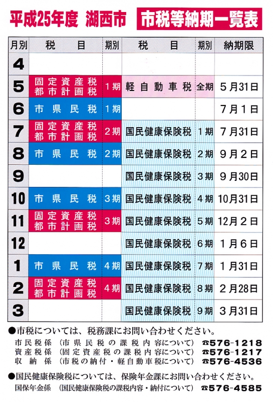TOP > トピック一覧 > お知らせ > 平成25年度 湖西市市税等 納期一覧表 全戸配布