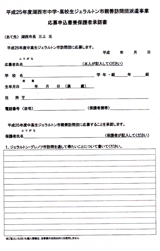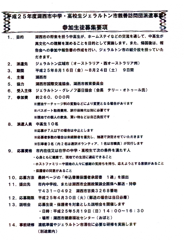 TOP > トピック一覧 > お知らせ > 参加生徒募集 (平成25年度 湖西市中高生ジェラルトン市親善訪問)